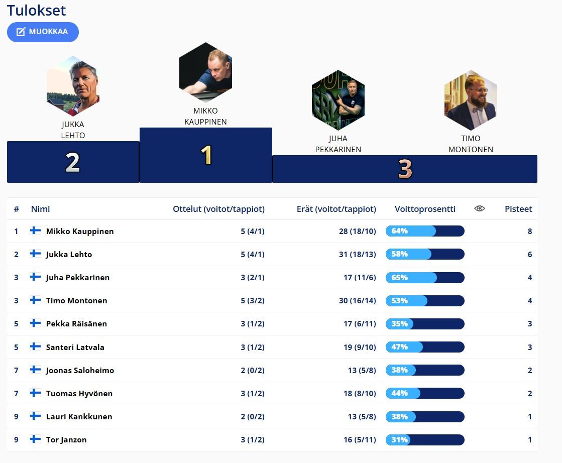 Kauden viimeiseen kisaan kerääntyi 10 pelaajaa joista kauden avannut Juuso Lukkari uusimpana nimenä. RG kärkeä ajatellen loppukiri jää ehkä turhan myöhään mutta mutta. Muista RG sijoista taistelu…