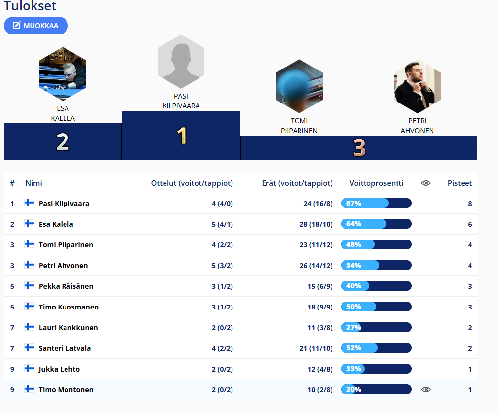Tänään kolmetoista kisaamassa ja mukavaa että 8 cup raja juuri ylittyy. Mukana yksi vieraspelaaja Tuomas Elo joka tosin sai kylmää kyytiä klubilaisilta tällä kertaa. Semeihin ponnisti Kalela/Ahvonen…