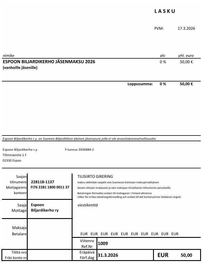 Laji: Kaisa Pelipaikka: Espoon Biljardikerhon klubi Pvm: lauantaina 13.6.2026 Alkamisaika: klo. 10:00 Osallistumismaksu: 30€ Osallistumisoikeus: kaikilla, 30 nopeinta pääsee mukaan Palkinnot: 100%…