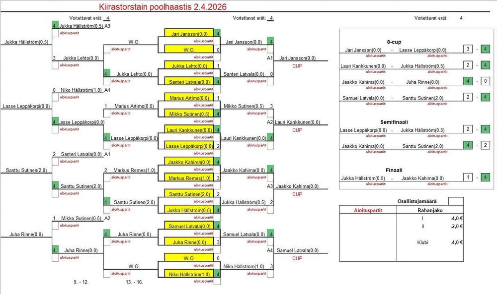 Kahdeksan klubilaista plus yksi vieras - Marius Artimo - tänään haastajaisissa ysipalloilemassa. Tällä kertaa pelattiin kaikki alkupelit vain kolmeen voittoon ja semit ja finaali sitten neljään…