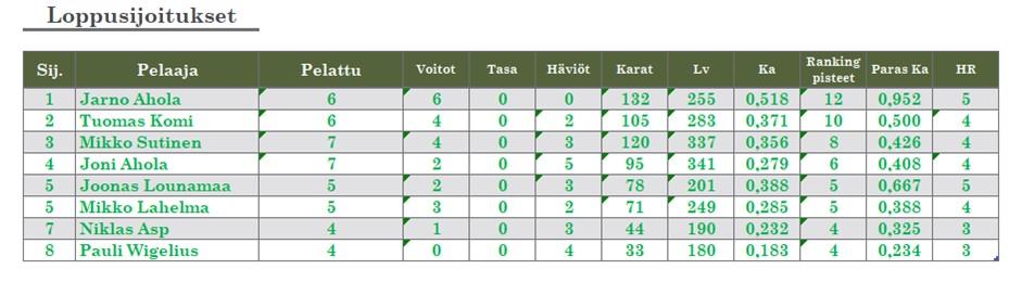 Playoffit: 25 pisteeseen, 50 lyöntivuororaja.