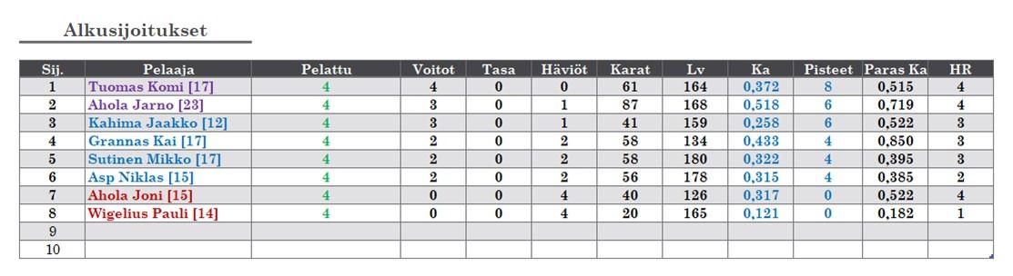 - Mikäli (1. pallo) valkoisella pelaava saavuttaa tavoitekaramäärän tai max. 50lv tulee täyteen, niin silloin (2. pallo) keltaisella pelaava lyö tasoittavan viimeisen lyöntivuoronsa aloitusasemasta.