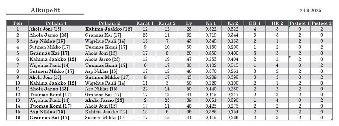 Mukana olijoiden kesken on oma Whatsapp rinki tuloksia ja pelien sopimisia varten. Osallistumismaksu 30e pitää maksaa 21.9.2025 mennessä joko käteisellä Joni Ahola / Tuomas Komi tai Mobile Pay (Joni Ahola 0407563627)