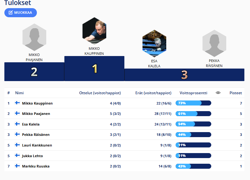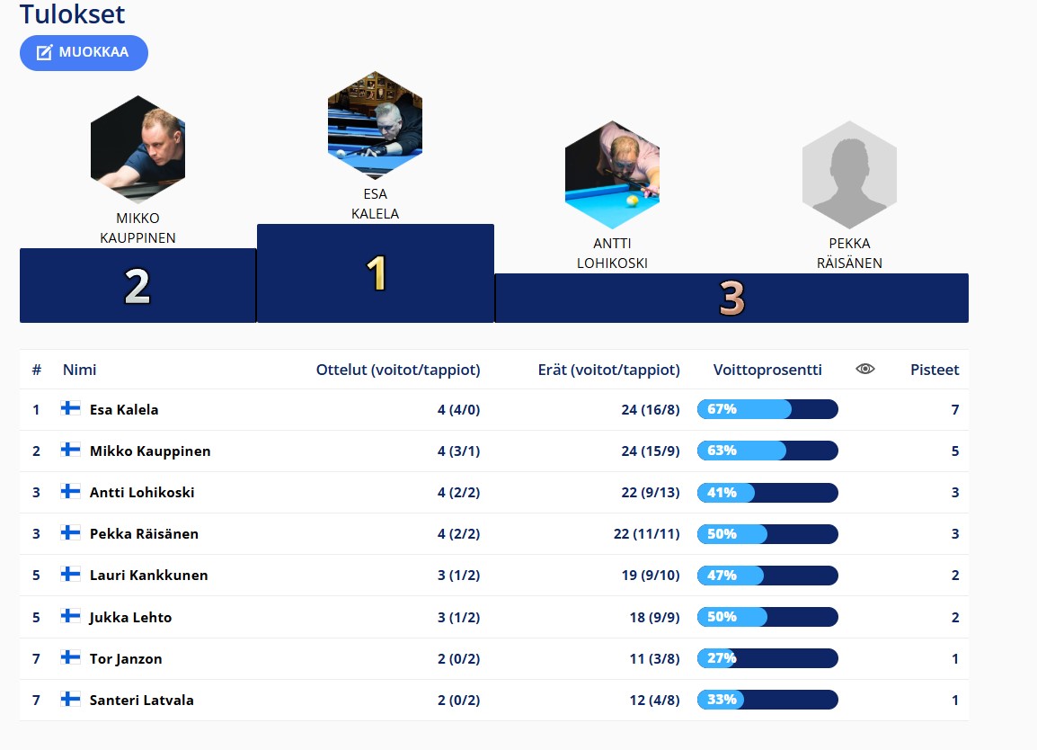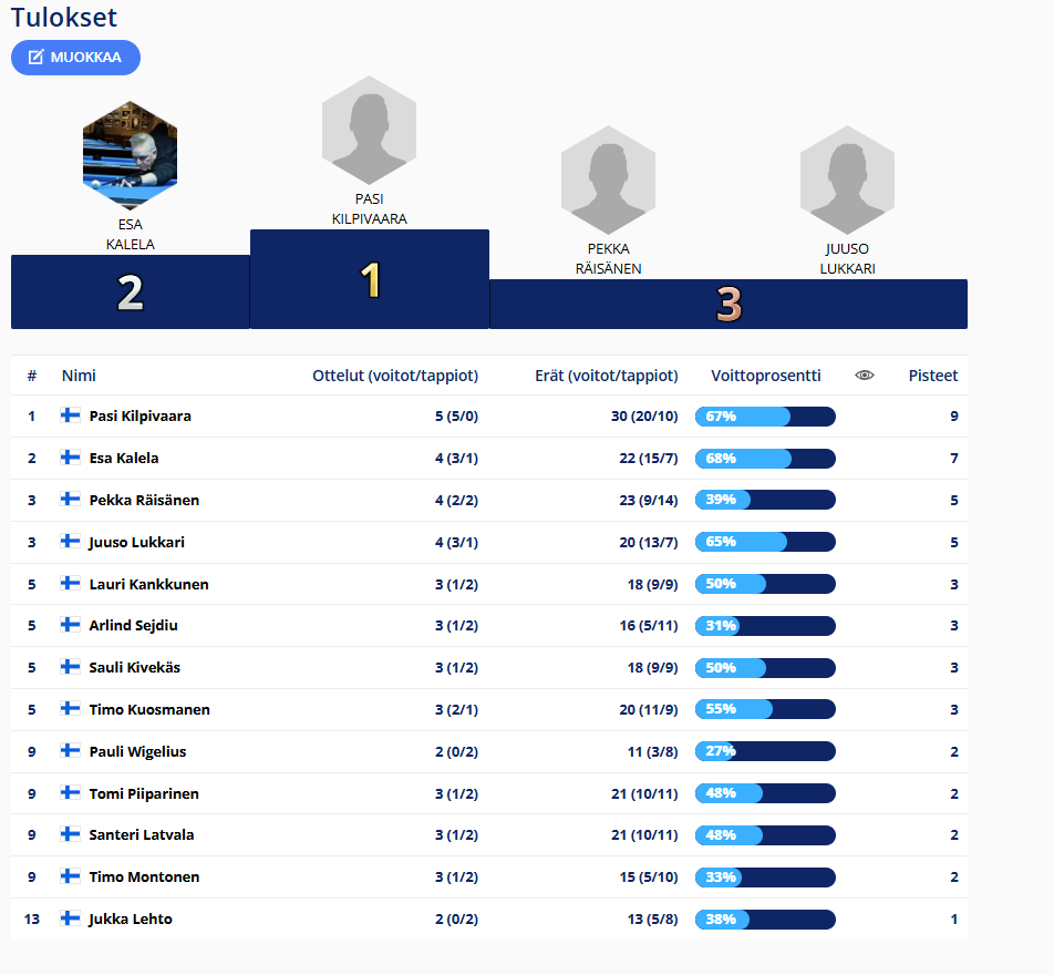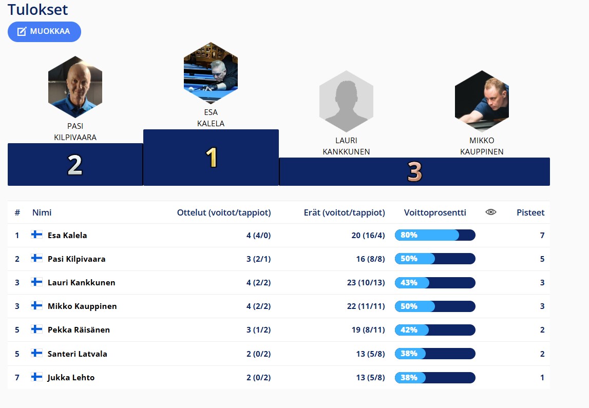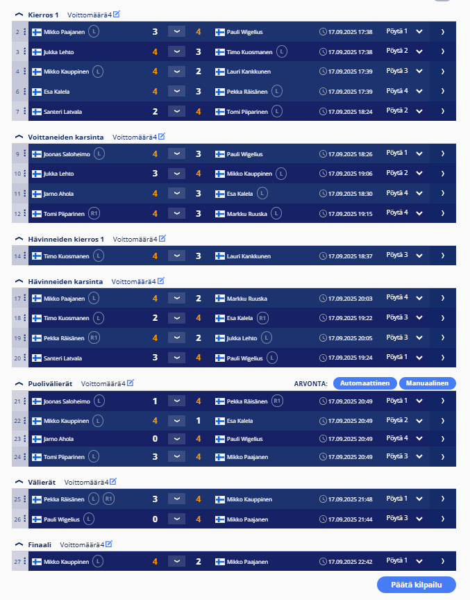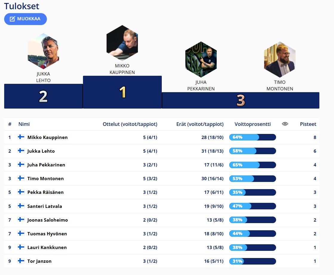 Tulokset kerätään tähän kauden osalta. Uutisissa tarkemmat raportit ja uusimmat tulokset.
