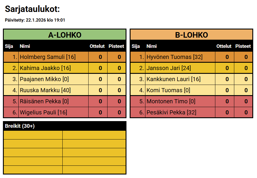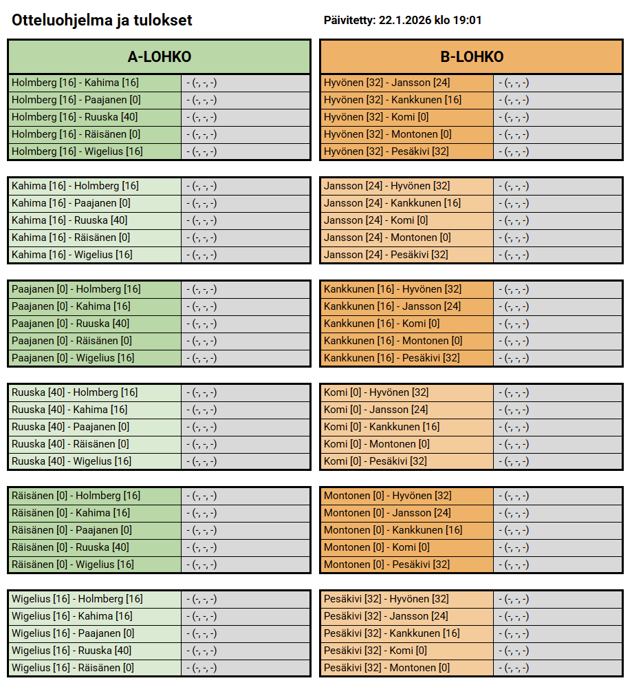 - Osallistujat on arvottu kahteen kuuden pelaajan lohkoon.