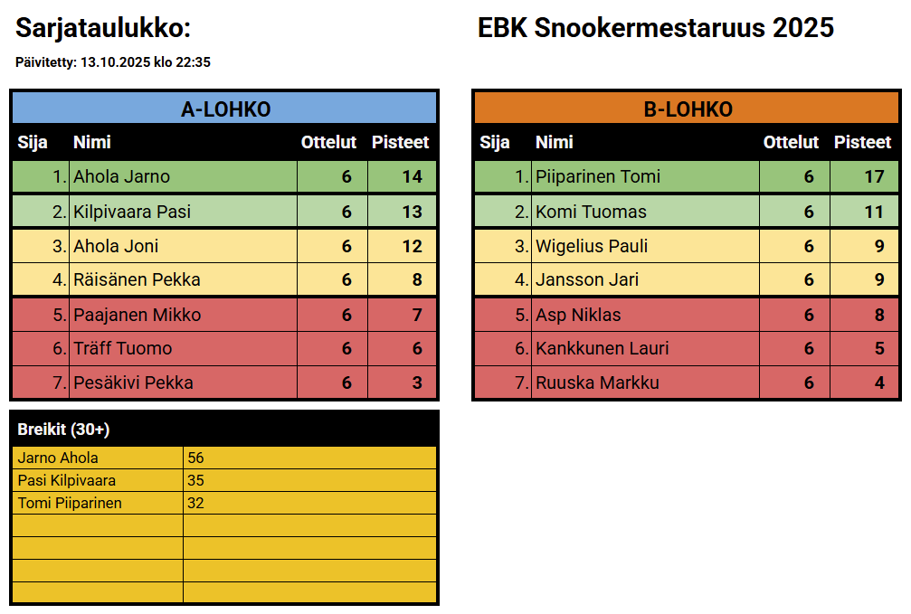 Semit sovittuna 23.10. ja pelattuna 27.10. mennessä.