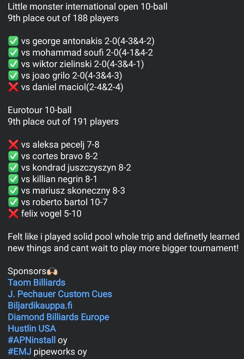 Casper Matikaisen voitettua keväällä upeasti 9-pallon Euroopanmestaruuden, hänellä on sen jälkeen pitänyt kiirettä kansainvälisten kilpailuiden osalta. Kaikkiin kutsuihin Cappe on vastannut myöntävästi ja pelaa tällä aktiivisemmin maailmalla kuin koskaan. Menestystäkin tulee mukavasti joten Cappe on selkeästi oikealla polulla ja jahtaa suurempia unelmia.