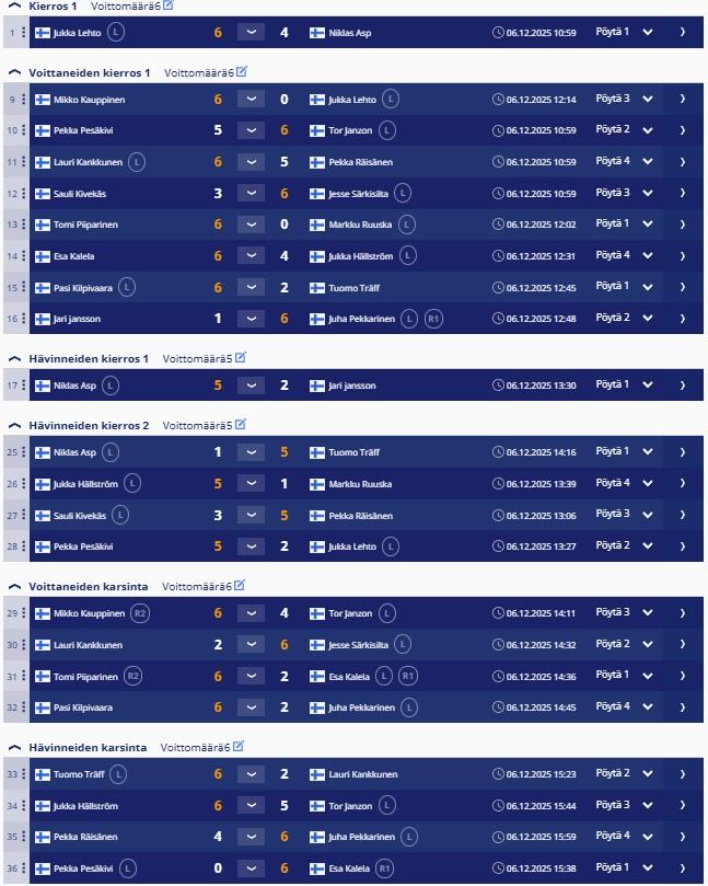 Prossipelissä Tuomo on päättänyt ottaa isännän paikan. 3-2 taulussa. Skobe kuitenkin kairaa vaikean partin tasoihin. Finaali vuorostaan kulkee hieman hitaammin ja harkitsevammin. 1-1 taulussa ja samalla hetkellä ysi onkin kopassa... Pasille 2-1. Himeimmän mitalin ottelussa peli on edennyt tasatilanteeseen 4-4. Tuomolla oli paikka karata jo hillille mutta ysi röpötteli ja näytti takalistoa. Finaalissa Pasi on päättänyt itsekkäästi menevän 4-1 johtoon. Peli näyttää hyvältä, ja mies vielä paremmalta. Jeppe kuuli tämän ja alkoi latomaan kuteja mailaansa. Lukemat heti 4-2