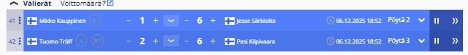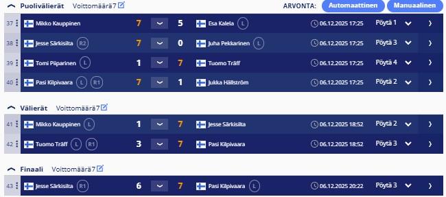 Nuorten pyssyjen semi käynnistyi Jepsterin komennossa. Takuuvarmalla työllä 3-0 johtoon. Main tablella Pasi päästi demonin irti ja otti myös 3-0 johdon (tätä kirjoittaessa meni 4-0 johtoon). Jotain täytyis tehä tuumas Tuomo? Semit vaikuttaa menevän ilman mitään draamaa tai käänteitä Jepelle ja Pasille.