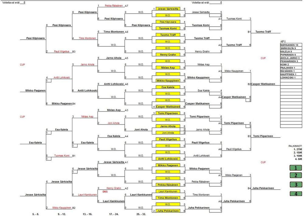 Casper Matikainen eteni myös odotetusti 8-cupiin puhtaalla pelillä. Eka voitti Esa Kalelasta tuli kuitenkin tiukan väännön päätteeksi 6-4. Mikko Kauppinen sen sijaan ei pystynyt laittamaan Matikaiselle kampoihin vaan joutui 1-6 numeroin lähteä hakemaan vauhtia vasemmasta laidasta.