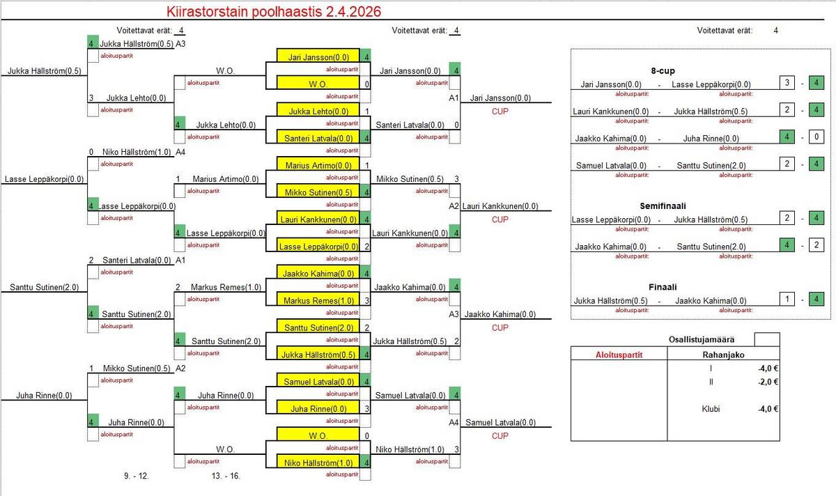 Neljällätoista pelaajalla pelattiin 8-cup kaaviolla, joka hiukan vähentää pelien määrää. Toisaalta myös kaikki treenipelaajat loistivat poissaolollaan tai luovuttivat suosiolla pöydät kisaajien käyttöön, joten koko illan oli neljä pöytää käytettävissä. Kisat etenivätkin siten yllättävän ripeästi.
