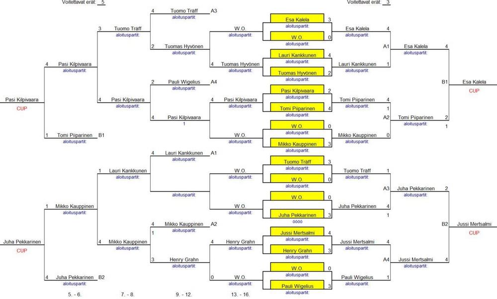 Keskiviikkomittelöihin saatiin tällä kertaa sakukoivullisen verran pelimiehiä kilvoittelemaan ysipallon herruudesta. Illan ainoa vierastuuppari Jussi Mertsalmi urakoi mainiosti alkukierroksilla nappaamalla kolme voittoa edeten puhtaalla pelillä cup-mittelöihin. Mertsin seuraksi cupiin selviytynyt Esa Kalela pääsi yhden ottelun helpommalla omalla polullaan saalistettuaan voitot Lauri Kankkusesta ja Tomi Piiparisesta. Kaavion vasemmalta puolelta jatkoon taivalsivat puolestaan Pasi Kilpivaara ja Juha Pekkarinen.