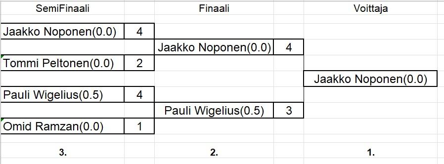 Lopulta kymmenen hengen voimin käytiin kisat. Suoraan semeihin kahdella voitolla Pauli ja Jake.