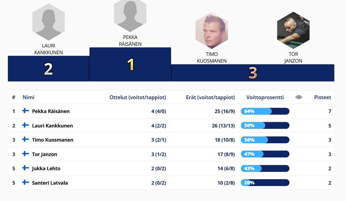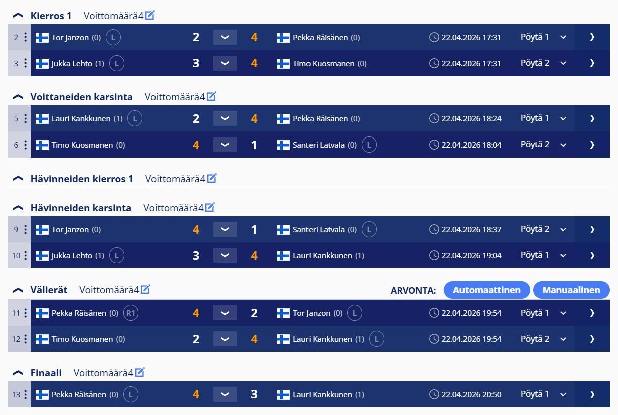 Kuuden voimin poolvikkis tällä kertaa. Paikalla vakiokasvot mutta finaaliin saadaan nyt ihan uusi pari koska Pasi ja Esa kumpikun puuttuvat. Semiparit tänään Räisänen / Janzon ja Kankkunen / Kuosmanen. Niin vaan kävi että Pekka ja Late kohtaavat finaalissa voitettuaan vastustajansa kumpikin 4-2 ja finaali on tätä kirjottaessa 3-1 Laten hyväksi. Mutta juuri Pekka upotti viimeiset kolme palloa ja tilanne siis tiukkenee 3-2. Seuravassa erässä Late pelaa todella hienosti kunnes päälleveto kasille menee pitkäksi ja vaihtoehtona on super ohut kulmaan tai kivellä liimat ysiin. Tästä valinta meni riskipussitukseen ja ohi jonka jälkeen Pekka pääsee vielä tasoittamaan 3-3 vaikka Latellakin oli siinä pitkä voittoysi jo välissä. Viimeisessä kontraerässäkin Late säkitteli hyvin 8 palloon asti joka ohi ja Pekka putsasi sitten pöydän ja keräsi tikkarit itselleen. Onnittelut !