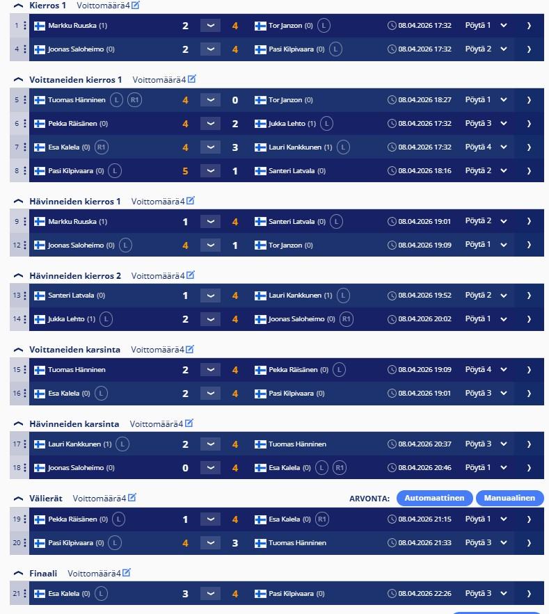 Kymmenen voimin Huhtikuun toinen viikkis. Koska Pasi ja Esa mukana niin yllättäen herrat kohtaavat jälleen finaalissa. Semeihin asti pääsi myös Pekka ja Tuomas Hänninen.