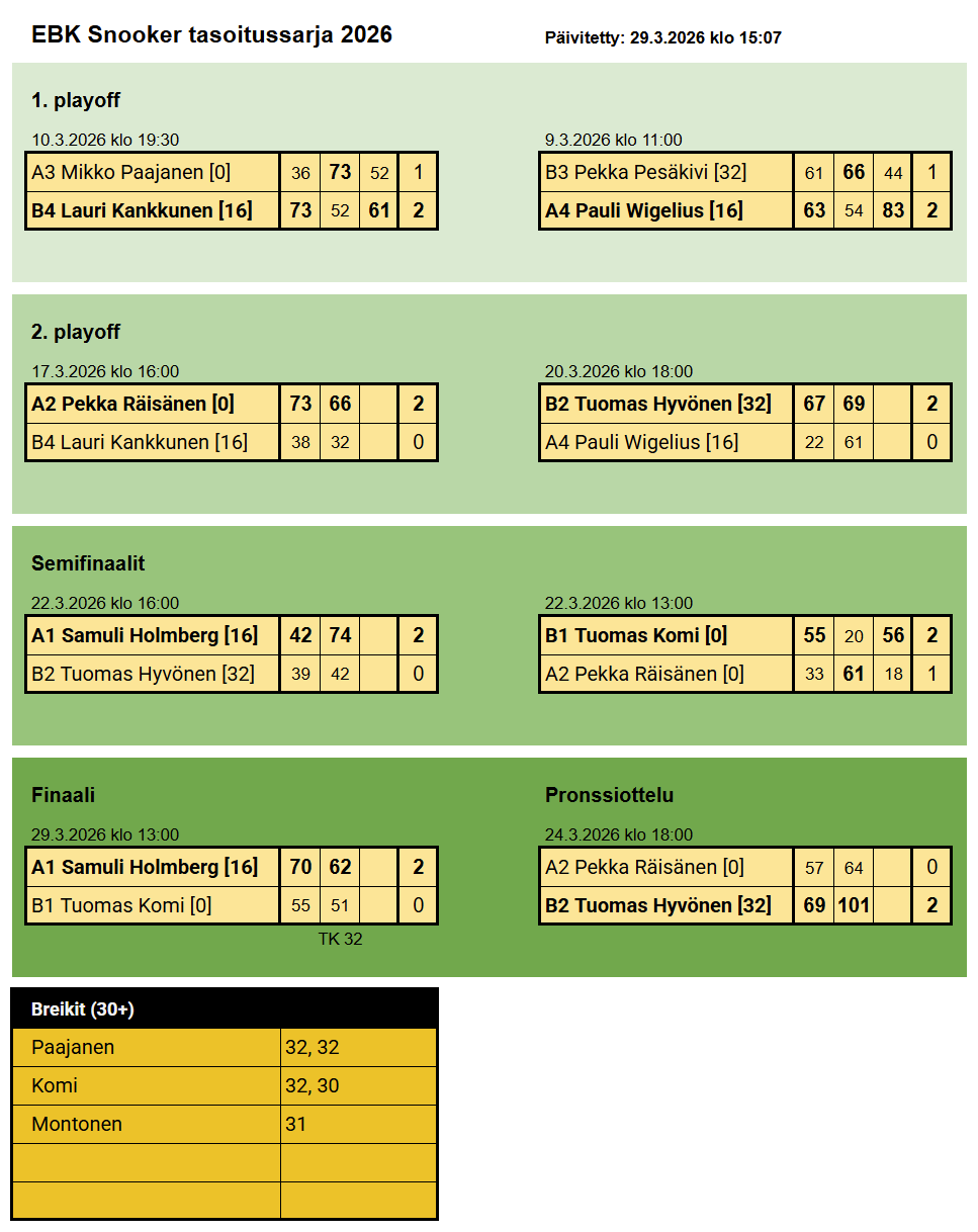 Talven 2026 aikana on pelattu EBK:n klubilla snookerin tasoitussarjaa ja voittajaksi pussitteli ensimmäistä kertaa Samuli Holmberg [16]. Hän voitti finaalissa Tuomas Komin [0] 2-0 eränumeroin 70-55 ja 62-51. Pronssiottelussa Tuomas Hyvönen [32] kukisti Pekka Räisäsen [0] niin ikään 2-0 (69-57, 101-64).