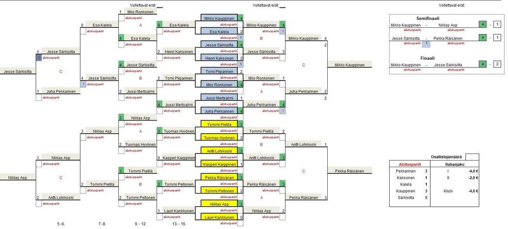 Finaalissa Jepster oli kaksikosta paremmin hereillä heti tuhinatuokion alkumetreillä siirtyen jo 2-0 johtoon. Pienoinen kisaväsymys painoi molempia sankareita ja paikkoja tuli välillä hieman yllättävistäkin tilanteista. Ja niinhän siinä lopulta kävi, että Kauppinen onnistui hyödyntämään saadut paikat lopulta aina neljän seuraavan erän veroisesti napaten kauden ensimmäisen viikkomittelövoiton lukemin 4-2.