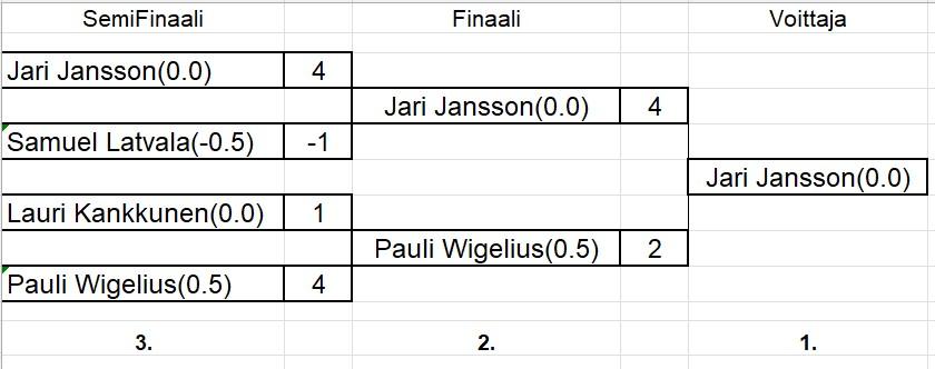 Kahdella voitolla semifinaaleihin etenivät tänään Late ja Jari, ja heidän seuraksi häviäjäpuolelta Pauli ja Samuel.