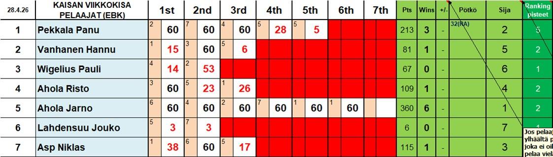 Vappuviikon kaisakisat pelattiin 6 vakiopelaajan, mutta kokonaisuudessa 7 pelaajan voimin. Wigelius saapui paikalle katselmoimaan päivän kunnon ja ilmoittautui intoa puhkuen kaisan viikkokisoihin. Päivän kunto oli kuin olikin riittävä tällä kertaa Ristolla ja Winhalla jotka molemmat saavuttivat Paulista voiton.